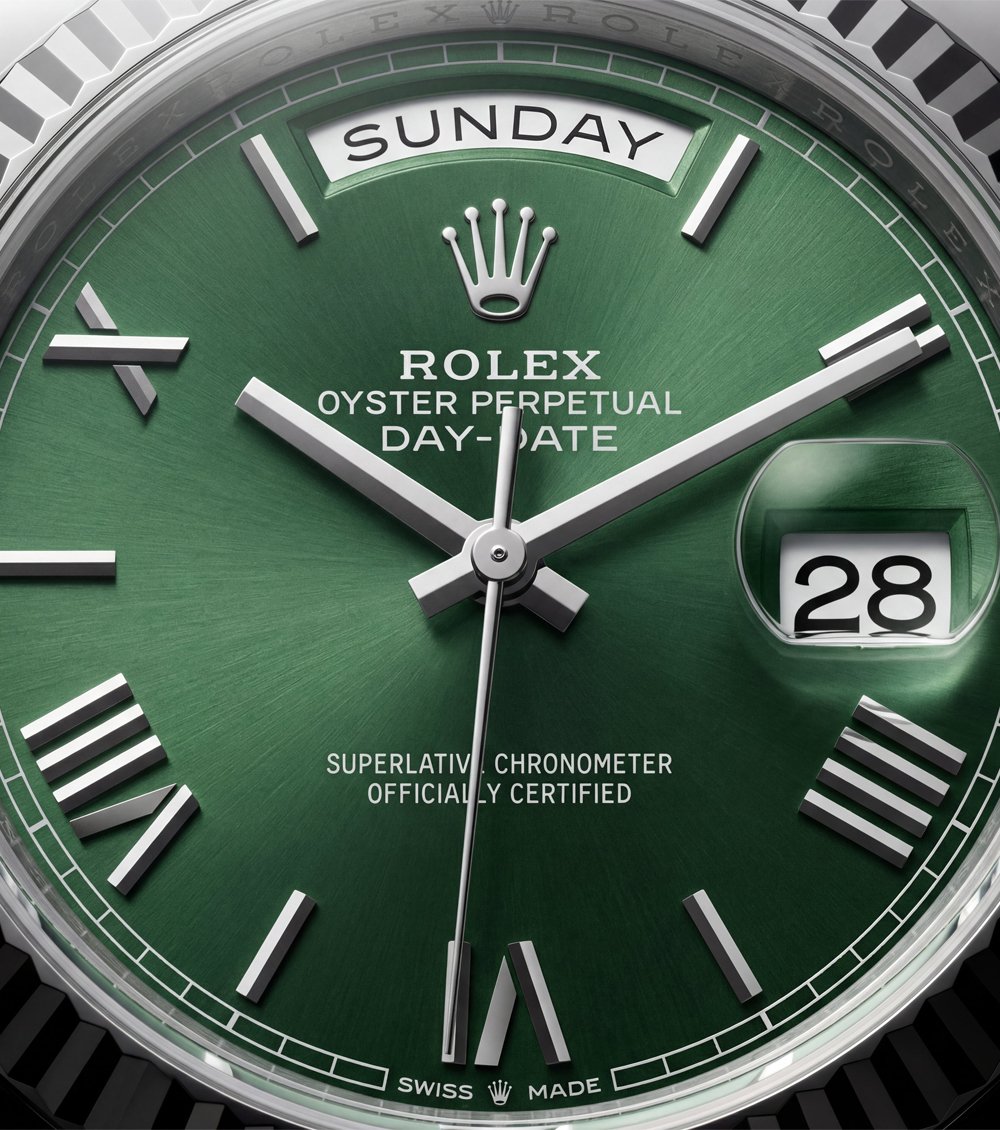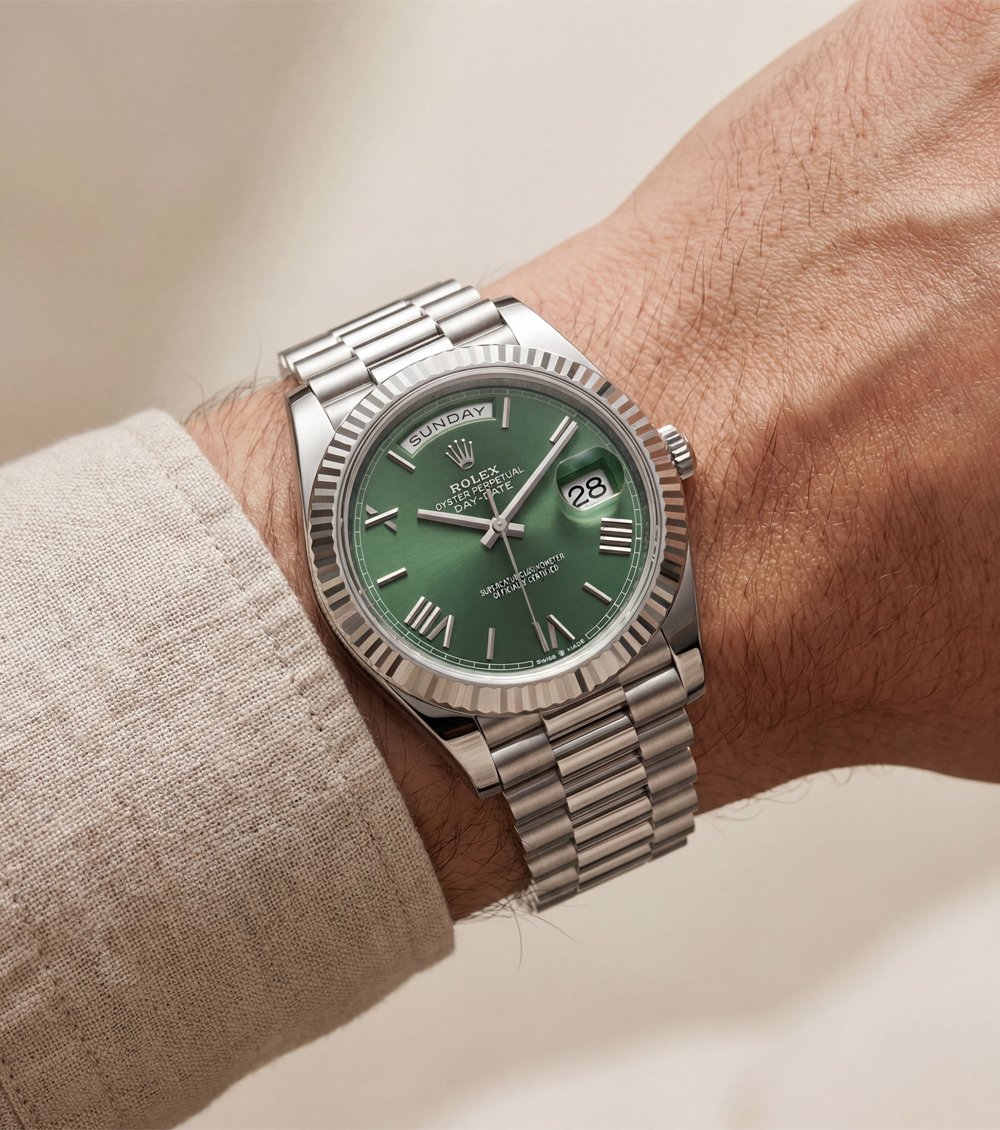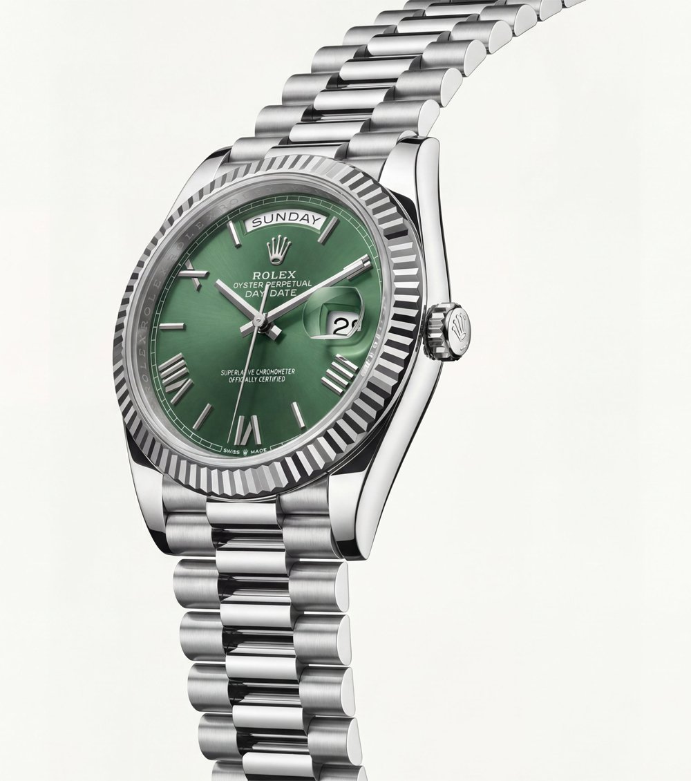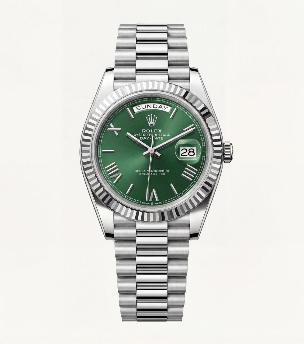 This silver-tone day-date Men’s watch features a rich emerald green sunburst dial paired with a timeless president-style stainless steel bracelet. The bold day display at 12 oรขโฌโขclock and date window at 3 oรขโฌโขclock give it an iconic luxury appearance, enhanced by a sharply finished fluted bezel.