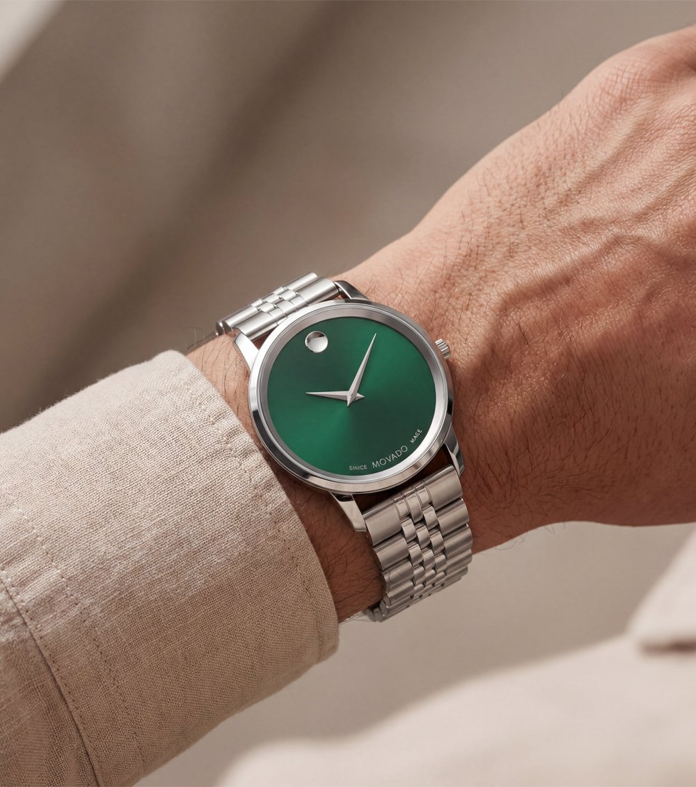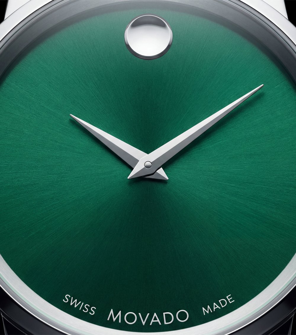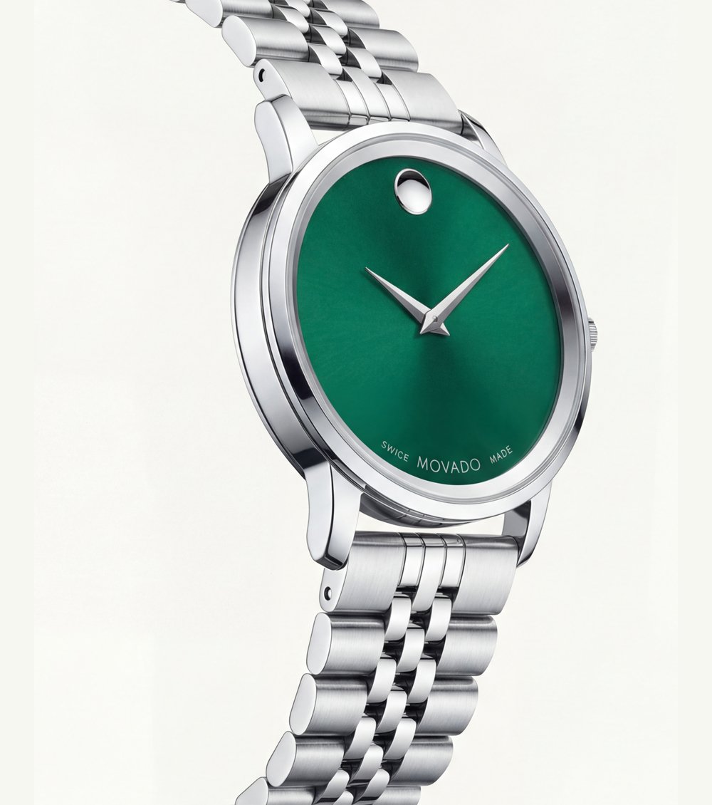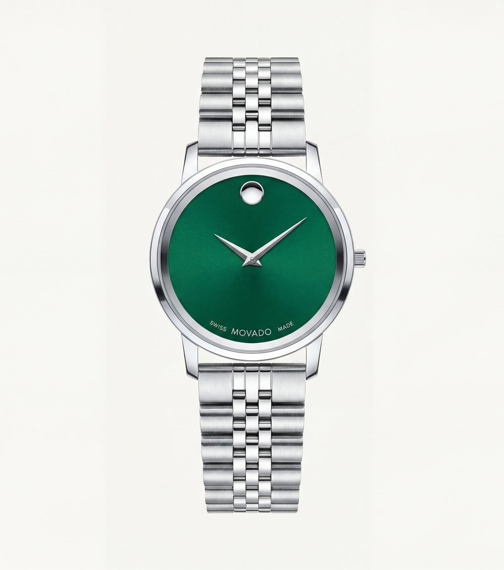 The smooth green dial features a signature single-dot marker at the 12 oรขโ‚ฌโ„ขclock position, creating a distinctive yet minimal visual identity. Slim metallic hands maintain clarity while preserving the watchรขโ‚ฌโ„ขs clean, uninterrupted aesthetic.