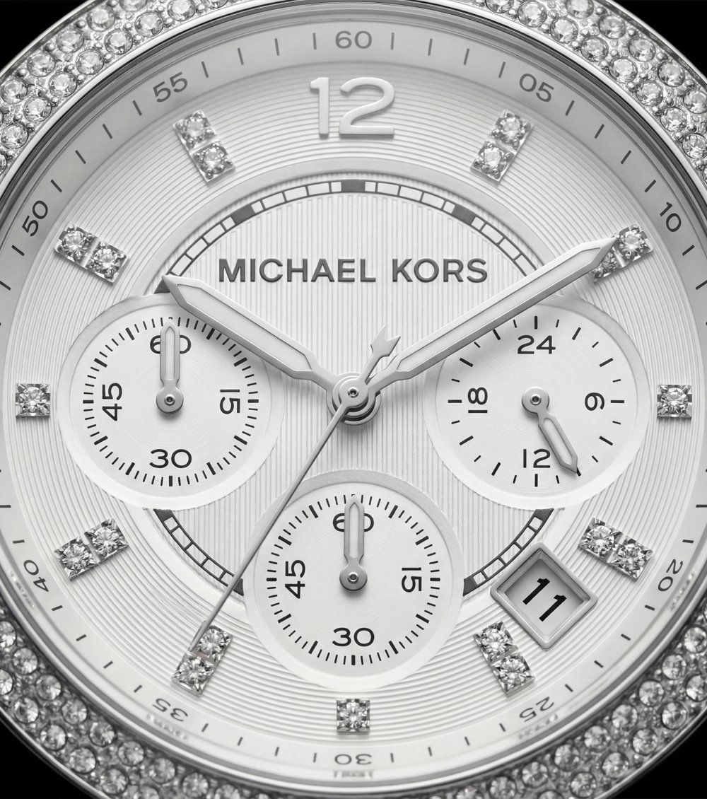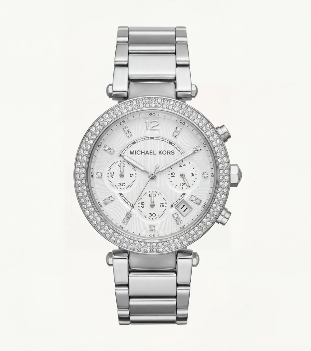 This all-silver crystal chronograph timepiece is designed for women who love refined glamour with maximum shine. The polished stainless steel bracelet pairs seamlessly with the fully crystal-embellished bezel, creating a radiant halo of light around the dia.