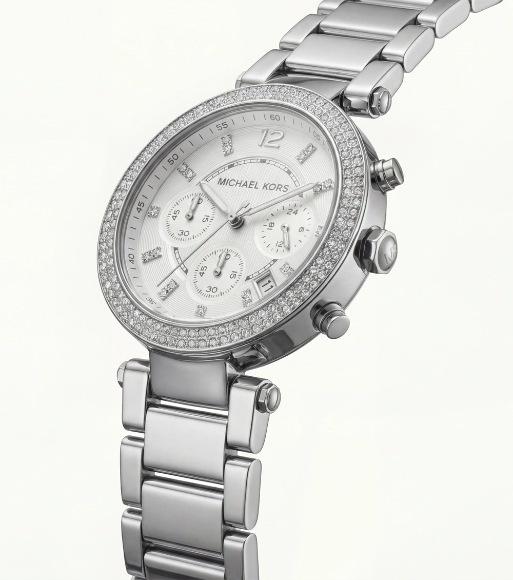 This all-silver crystal chronograph timepiece is designed for women who love refined glamour with maximum shine. The polished stainless steel bracelet pairs seamlessly with the fully crystal-embellished bezel, creating a radiant halo of light around the dial.