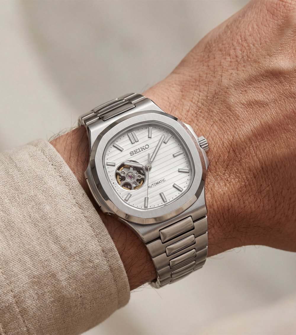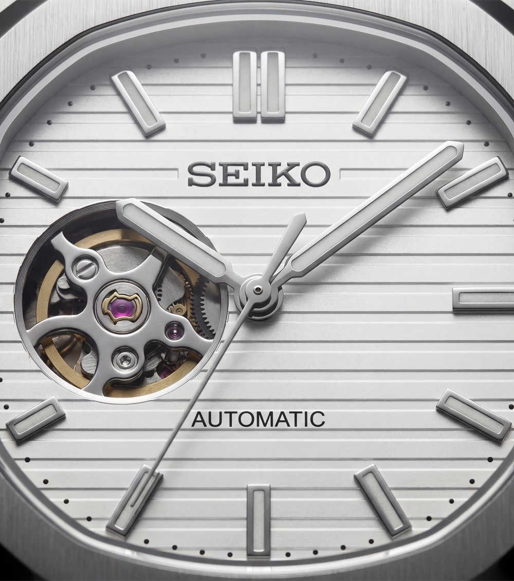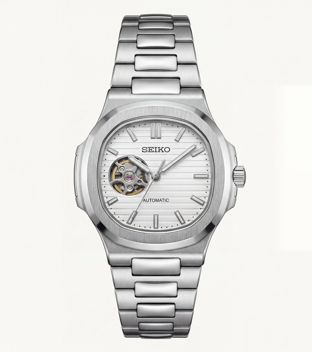 The horizontally detailed ivory dial enhances subtle depth while maintaining a bright and balanced aesthetic. Applied silver-tone hour markers and polished hands ensure clear readability, while the open-heart aperture reveals the mechanical movement in motion โ highlighting the craftsmanship within.