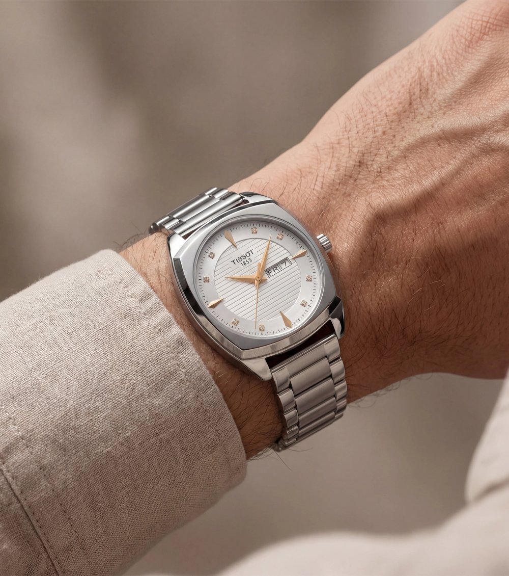 Designed for those who value classic luxury with subtle detailing, this timepiece offers a day and date display for added practicality. Ideal for formal occasions, office wear, and refined daily use, it delivers understated elegance with a premium finish. Brand: Tissot.