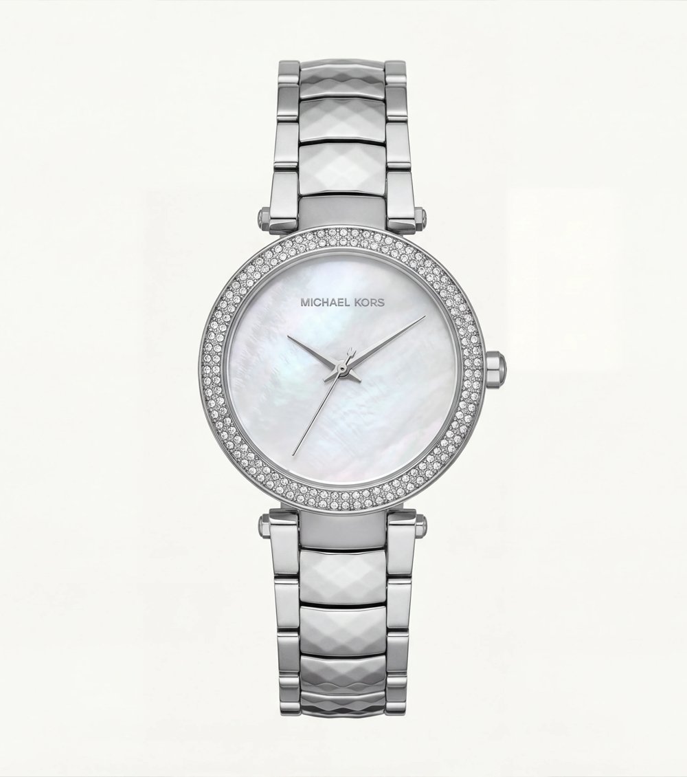 Framing the face is a fully crystal-embellished silver-tone bezel, delivering refined brilliance that enhances the watchรขโ‚ฌโ„ขs premium appeal without overpowering its elegance.