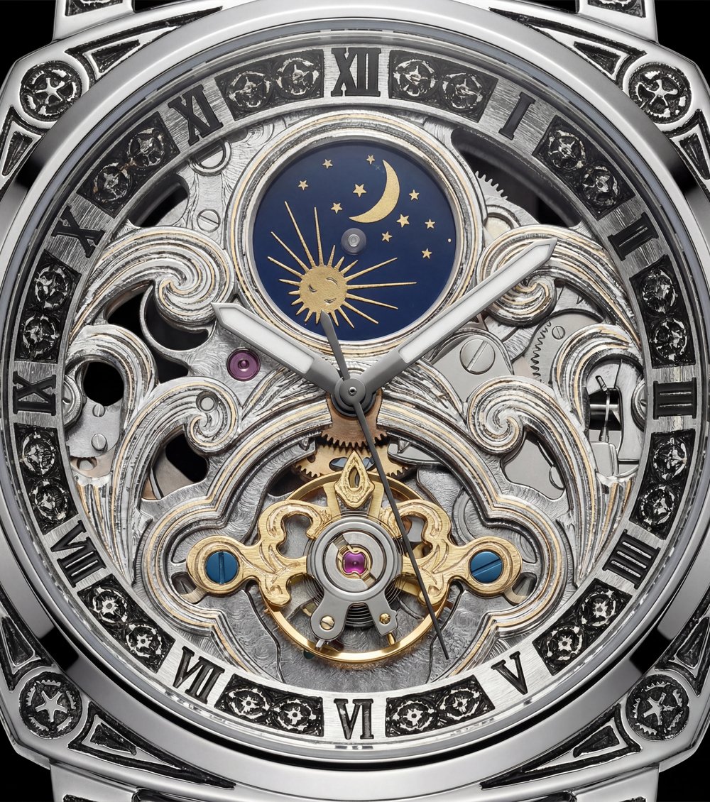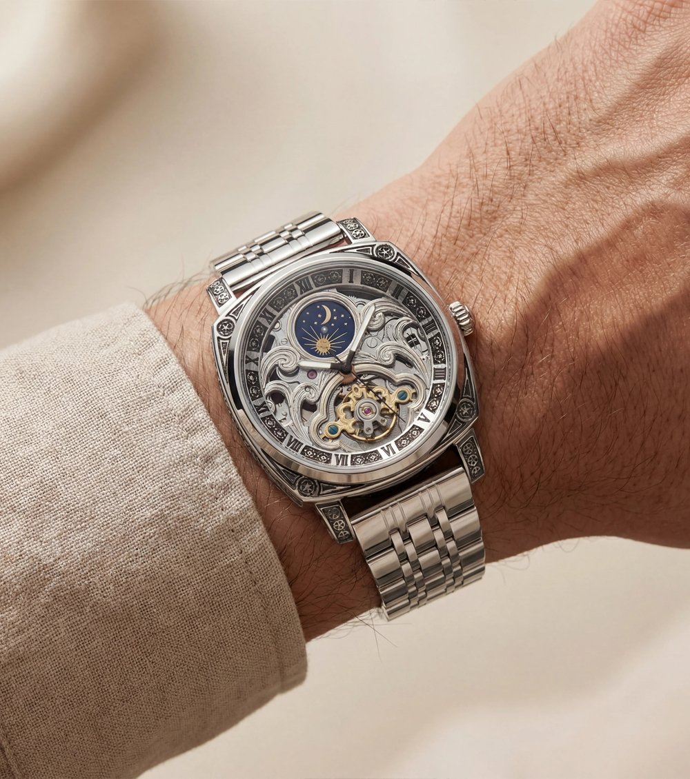 This luxury Men’s watch features an intricately designed skeleton dial that showcases detailed mechanical artistry. The upper moonphase display with sun and crescent detailing adds a celestial touch, while the open-heart window at the center reveals the finely crafted automatic movement. Elegant Roman numeral hour markings and engraved accents around the dial enhance its classic, vintage-inspired appeal.