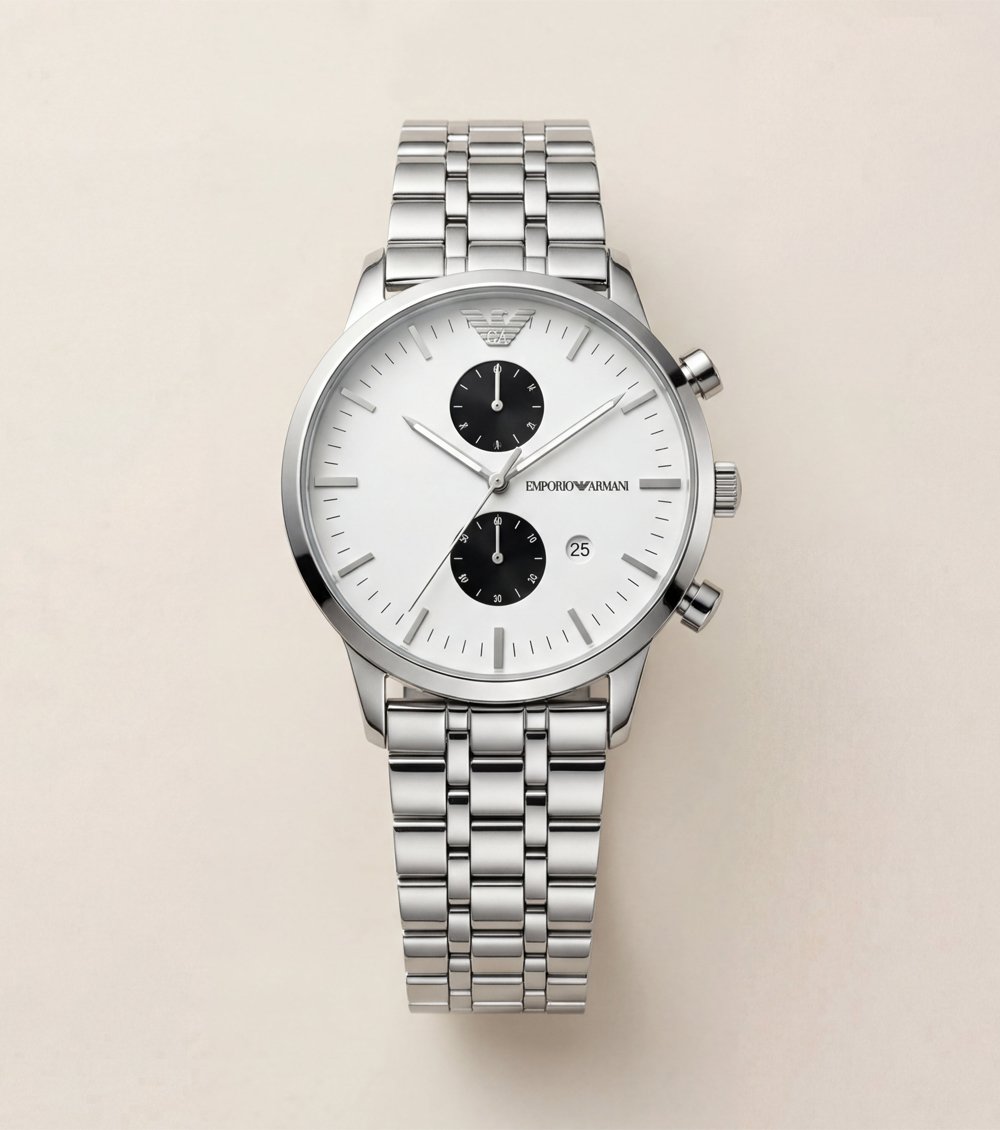 The crisp white dial is beautifully balanced with contrasting black chronograph sub-dials, delivering a clean, minimalist aesthetic with a sharp modern edge. Slim applied index markers and polished silver hands enhance readability, while the subtle date window adds everyday practicality without disrupting the dialรขโฌโขs symmetry.