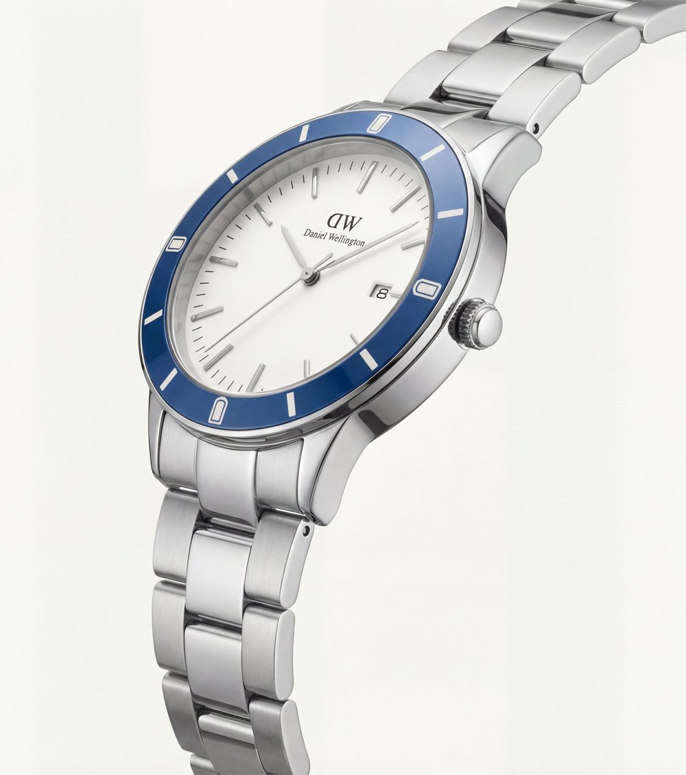 This refined Men’s watch blends classic minimalism with a fresh modern accent. The clean white dial is perfectly balanced with slim silver hour markers and sharp hands, offering excellent readability and an elegant appearance. A striking blue fixed bezel adds a subtle pop of color, elevating the overall design while keeping it sophisticated and versatile.