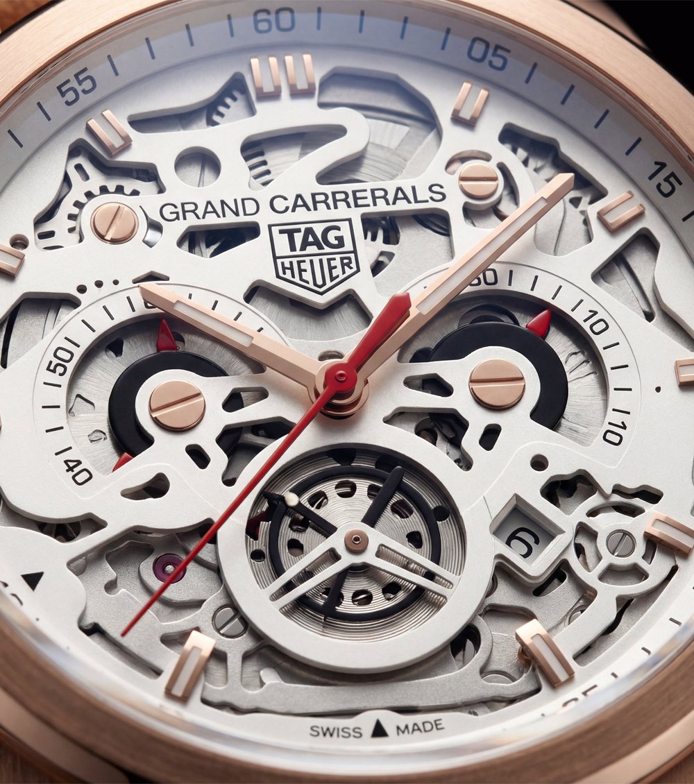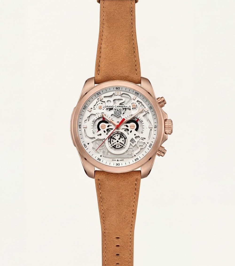 This luxury Men’s skeleton chronograph watch showcases a striking open-work dial that reveals intricate inner detailing, delivering a bold and sophisticated mechanical look. The rose-gold tone case paired with a rich tan leather strap adds elegance and modern masculinity.