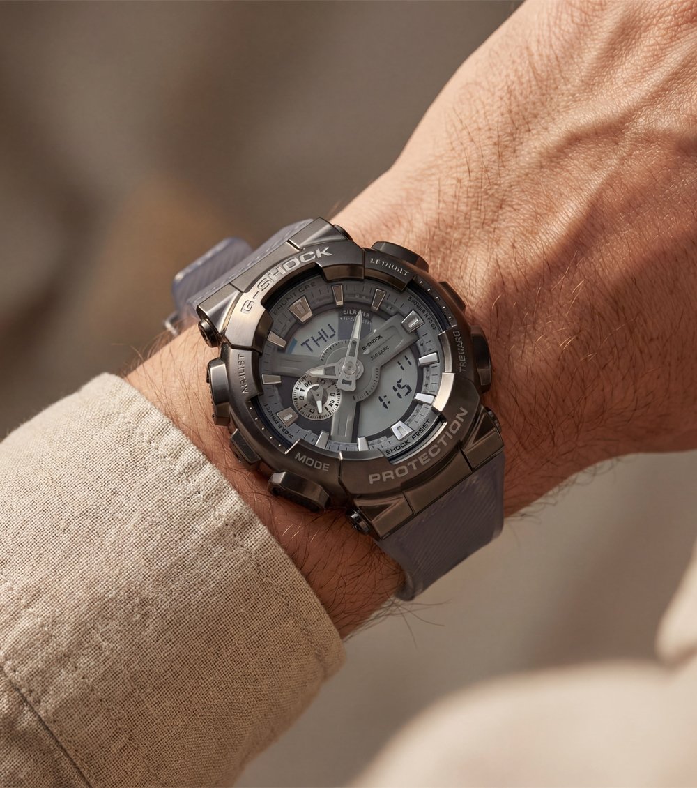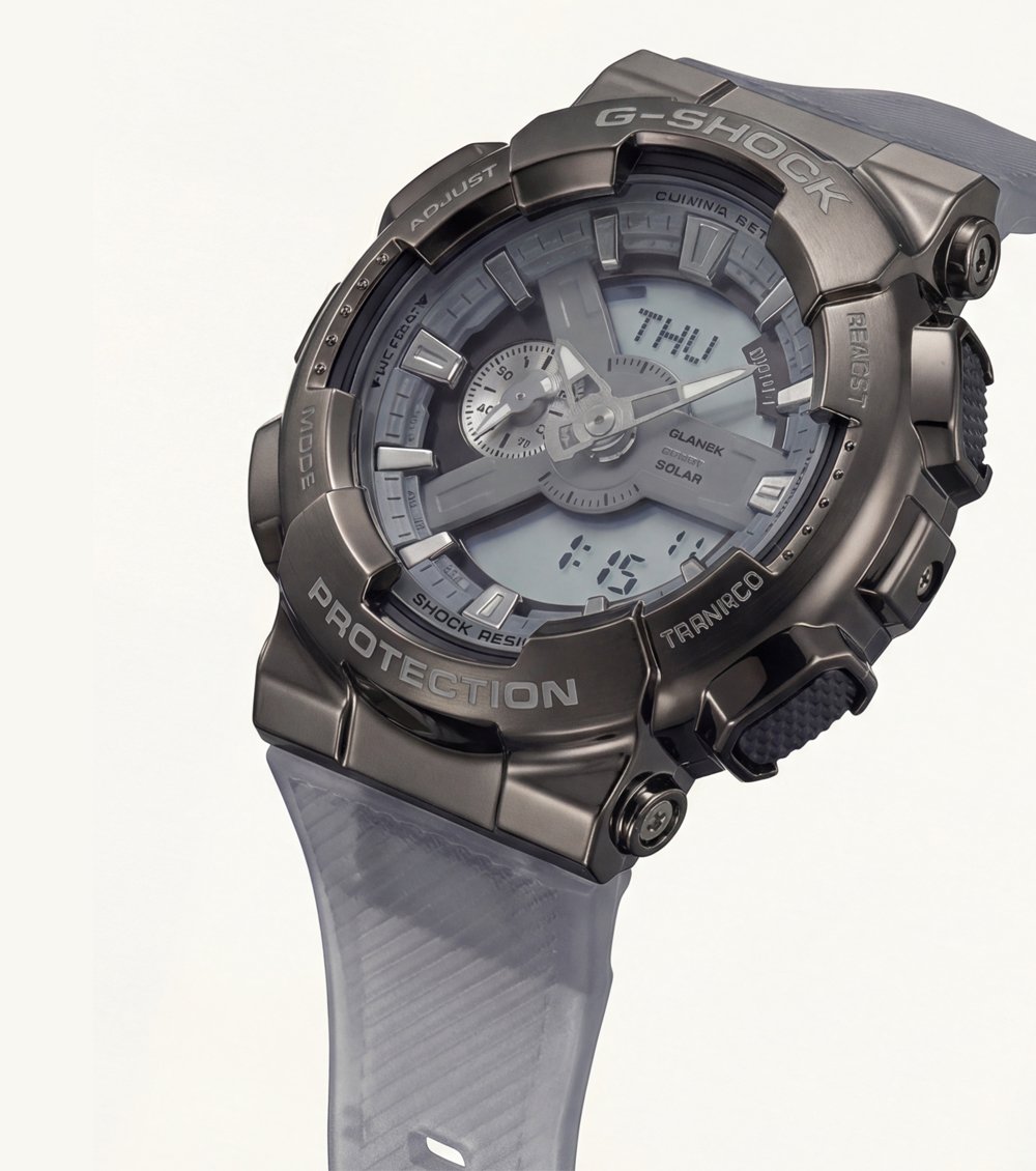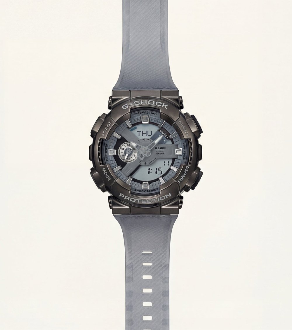 A reinforced protective case surrounds the dial, providing durability and impact resistance for active use. The semi-transparent resin strap adds a unique visual edge while ensuring flexibility, comfort, and a secure fit throughout the day. Subtle metallic accents on the hands and markers bring depth and precision without overpowering the refined design.