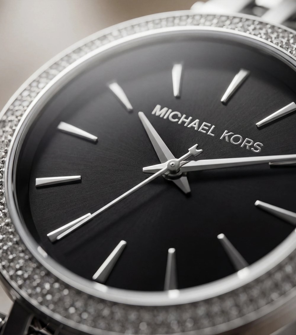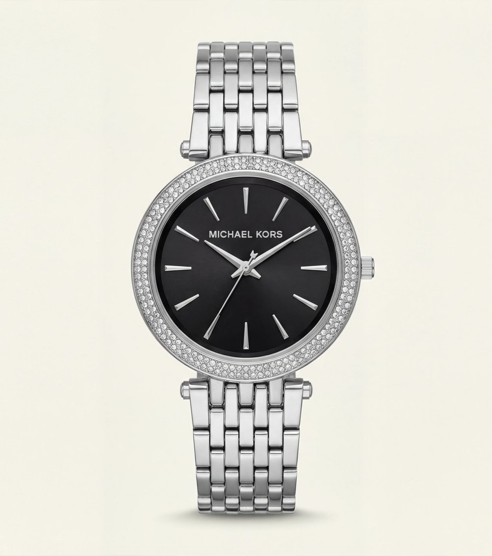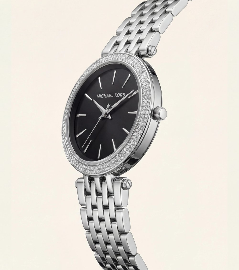 Slim metallic hour markers and graceful hands preserve the clean minimalist design, allowing the brilliance of the crystal bezel and the depth of the dial to take center stage. The multi-link stainless steel bracelet adds sophistication while ensuring a comfortable and secure fit.