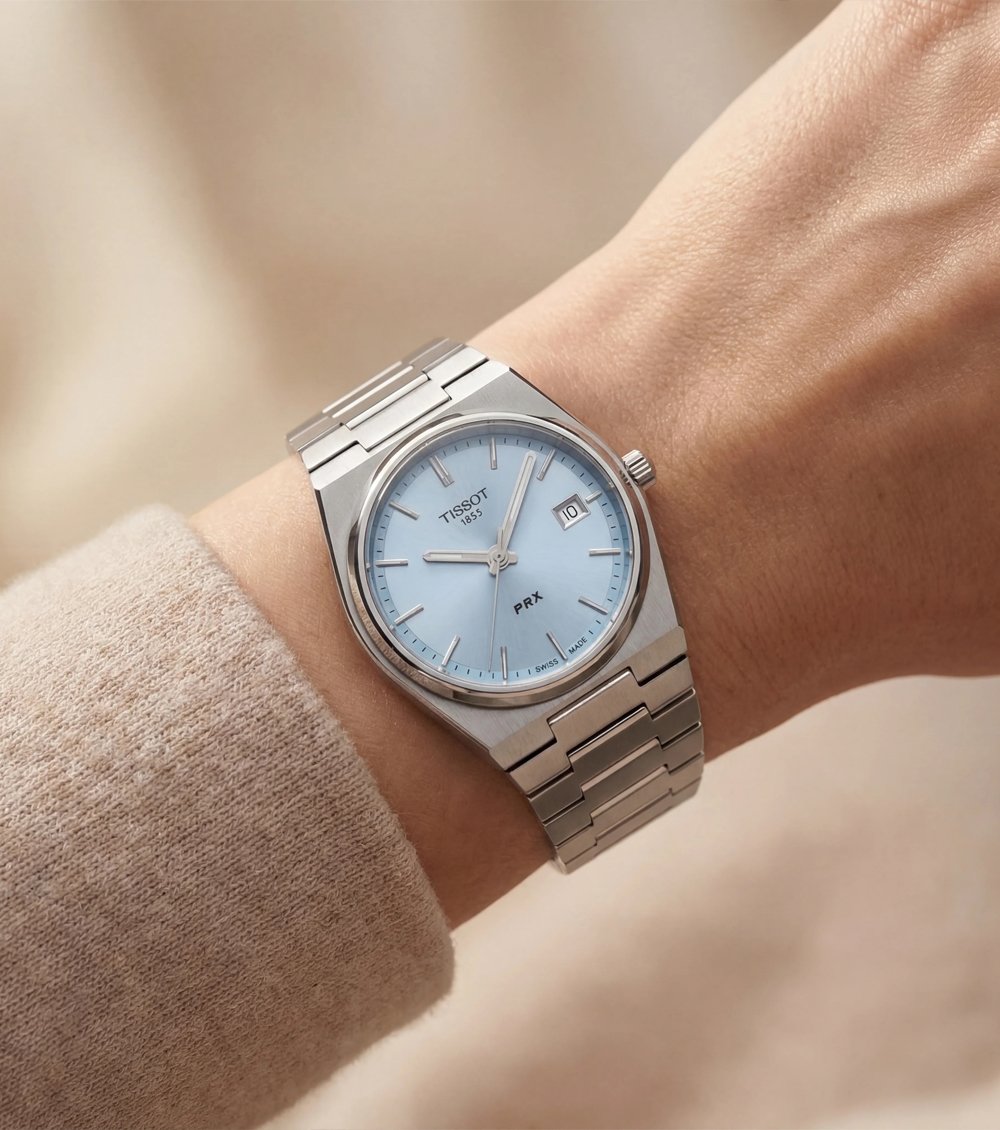Crafted for women who appreciate refined minimalism with a contemporary edge, this stainless steel timepiece features a refreshing ice blue sunburst dial set within a sharply contoured case. The integrated bracelet design creates a seamless architectural flow, offering a clean and confident wrist presence.