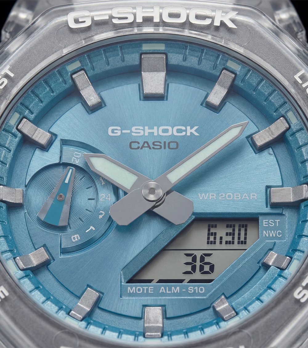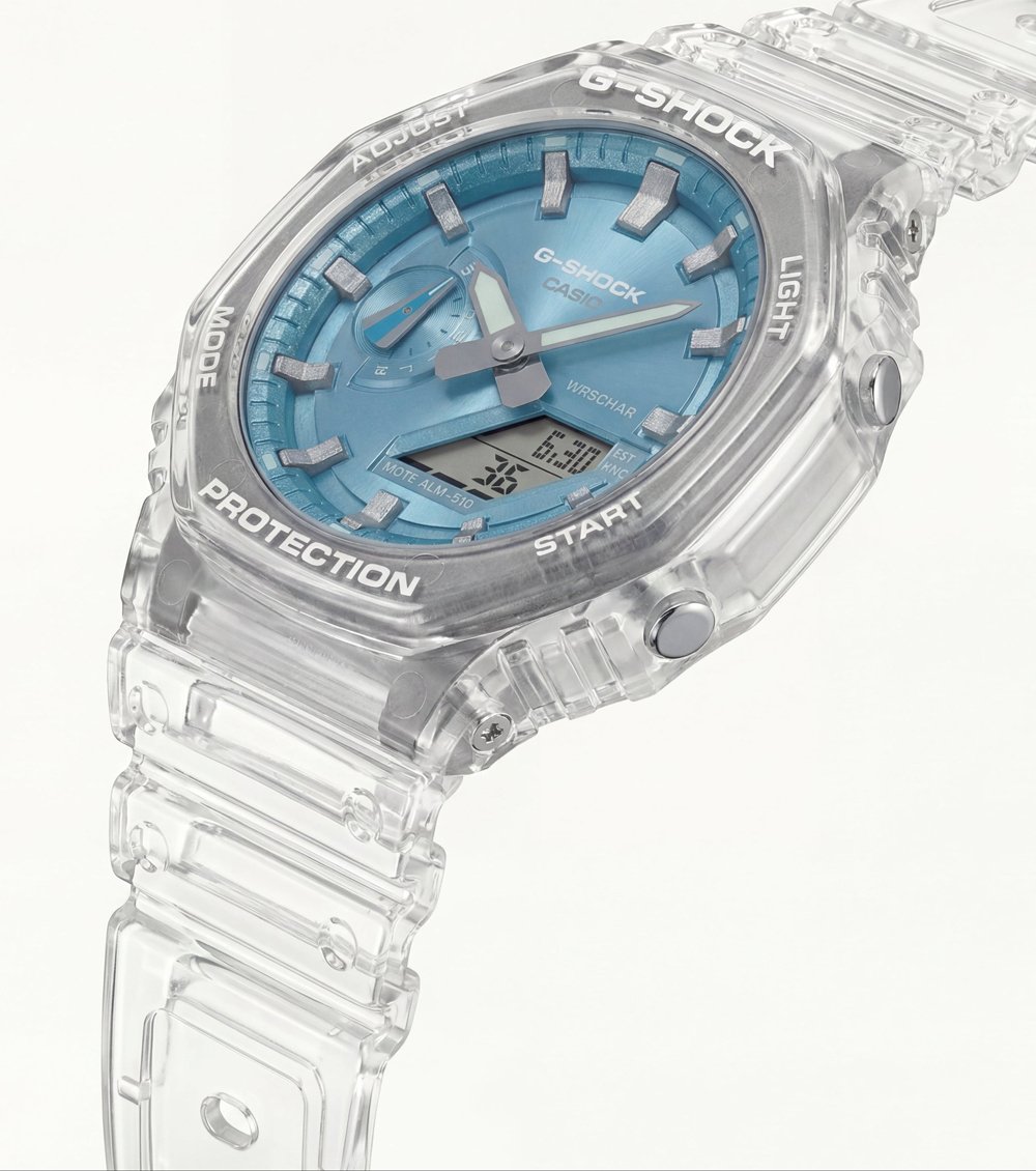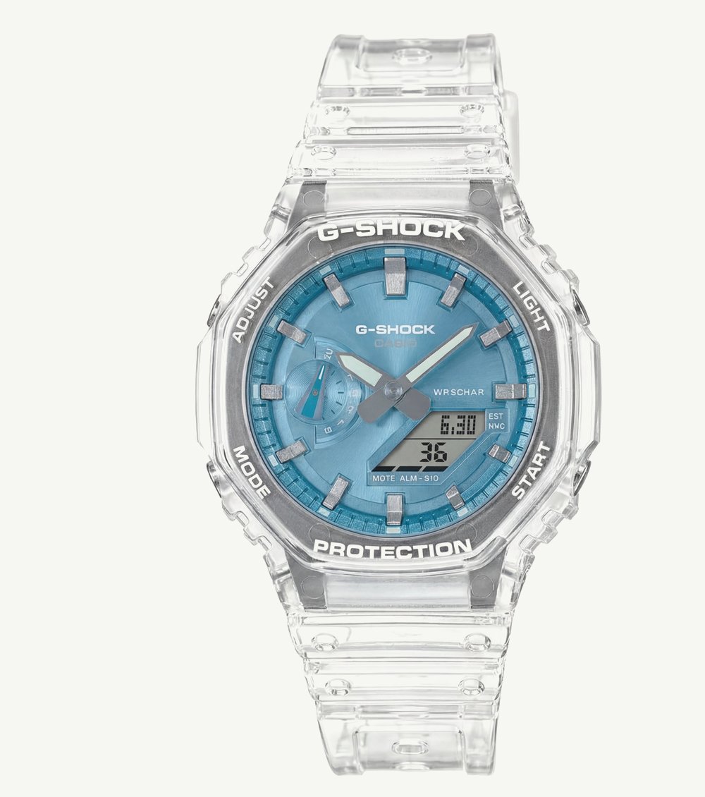 This modern sports watch features a transparent case and strap paired with a striking blue dial, creating a bold and futuristic look. The dual analog-digital display offers easy readability and multiple functions, making it perfect for active lifestyles.