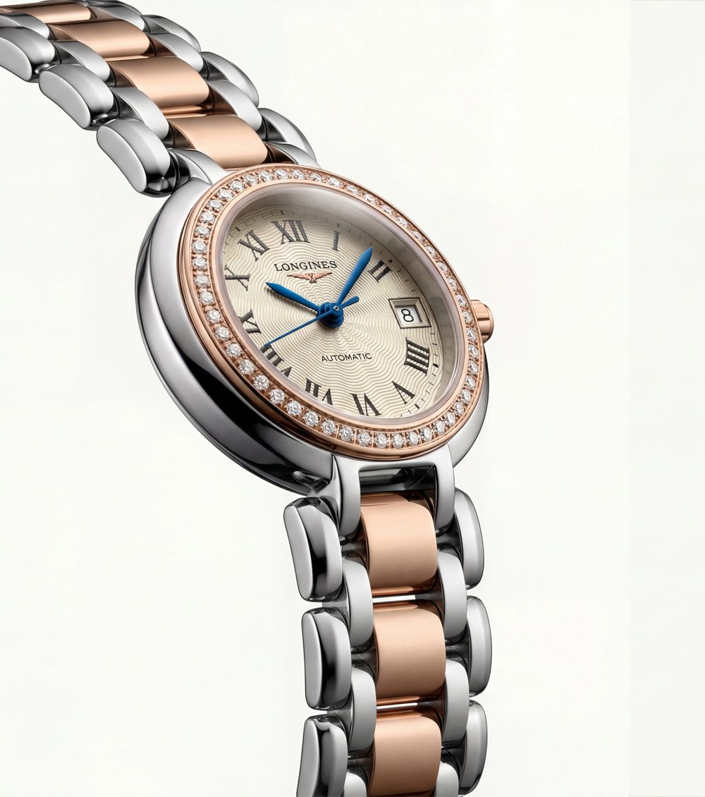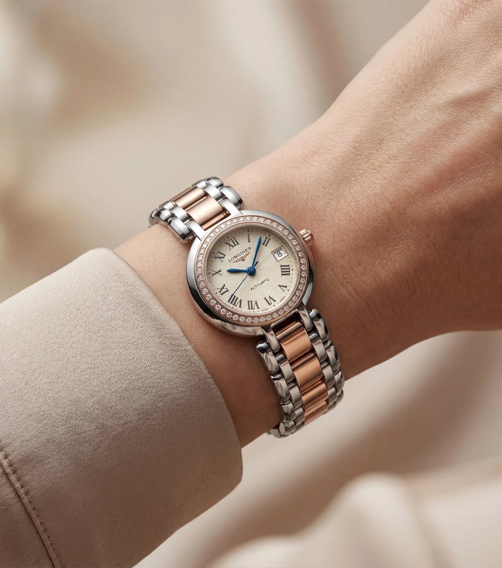 This exquisite timepiece blends timeless European elegance with modern luxury detailing. The two-tone stainless steel bracelet โ€” polished silver links with warm rose gold center accents โ€” creates a graceful contrast that feels both sophisticated and versatile.