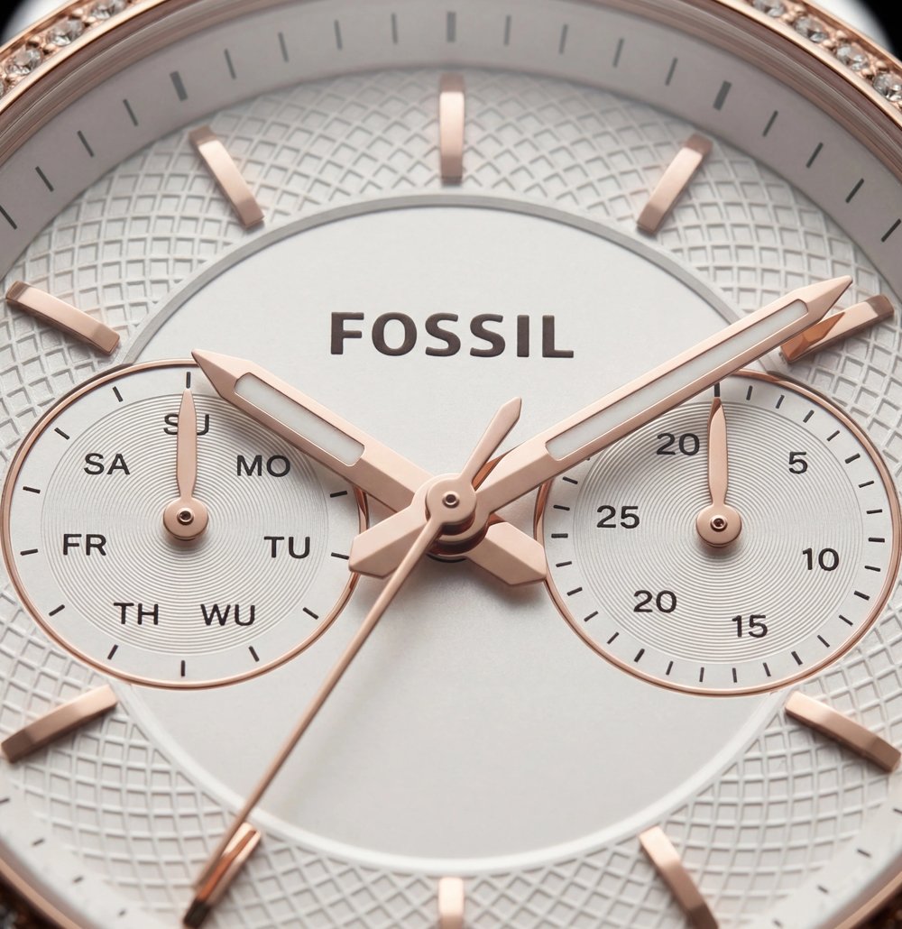 The textured inner dial enhances depth and dimension, while dual sub-dials provide day and 24-hour functionality for practical precision. Rose gold markers and hands stand out beautifully against the soft white dial, delivering clarity with a graceful finish.