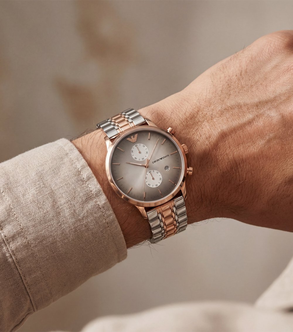 The smooth champagne-grey dial features minimalist hour markers, slim rose gold hands, and dual chronograph sub-dials that add functional depth without overpowering the design. A neatly positioned date window enhances everyday usability while maintaining a clean, sophisticated layout.