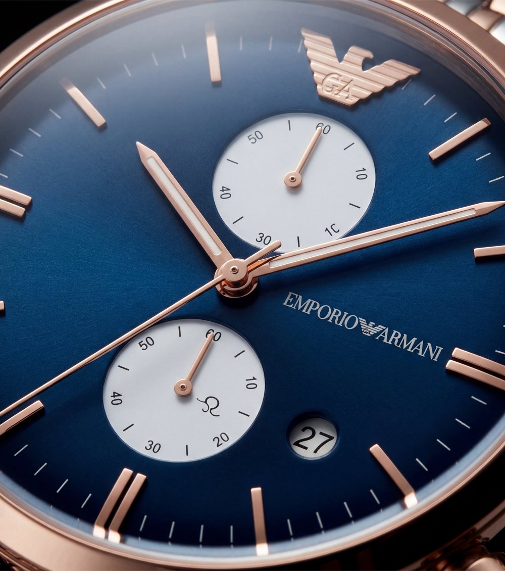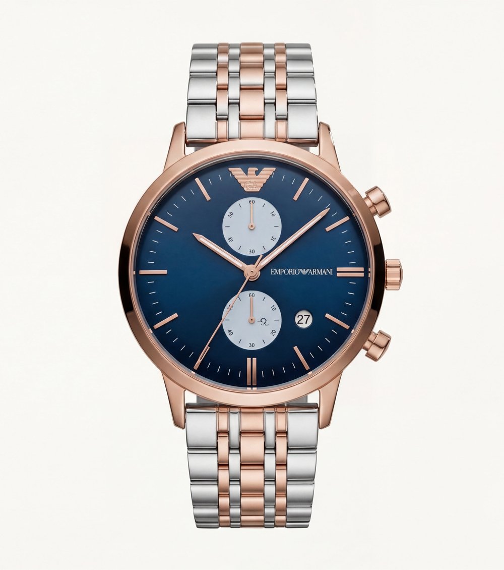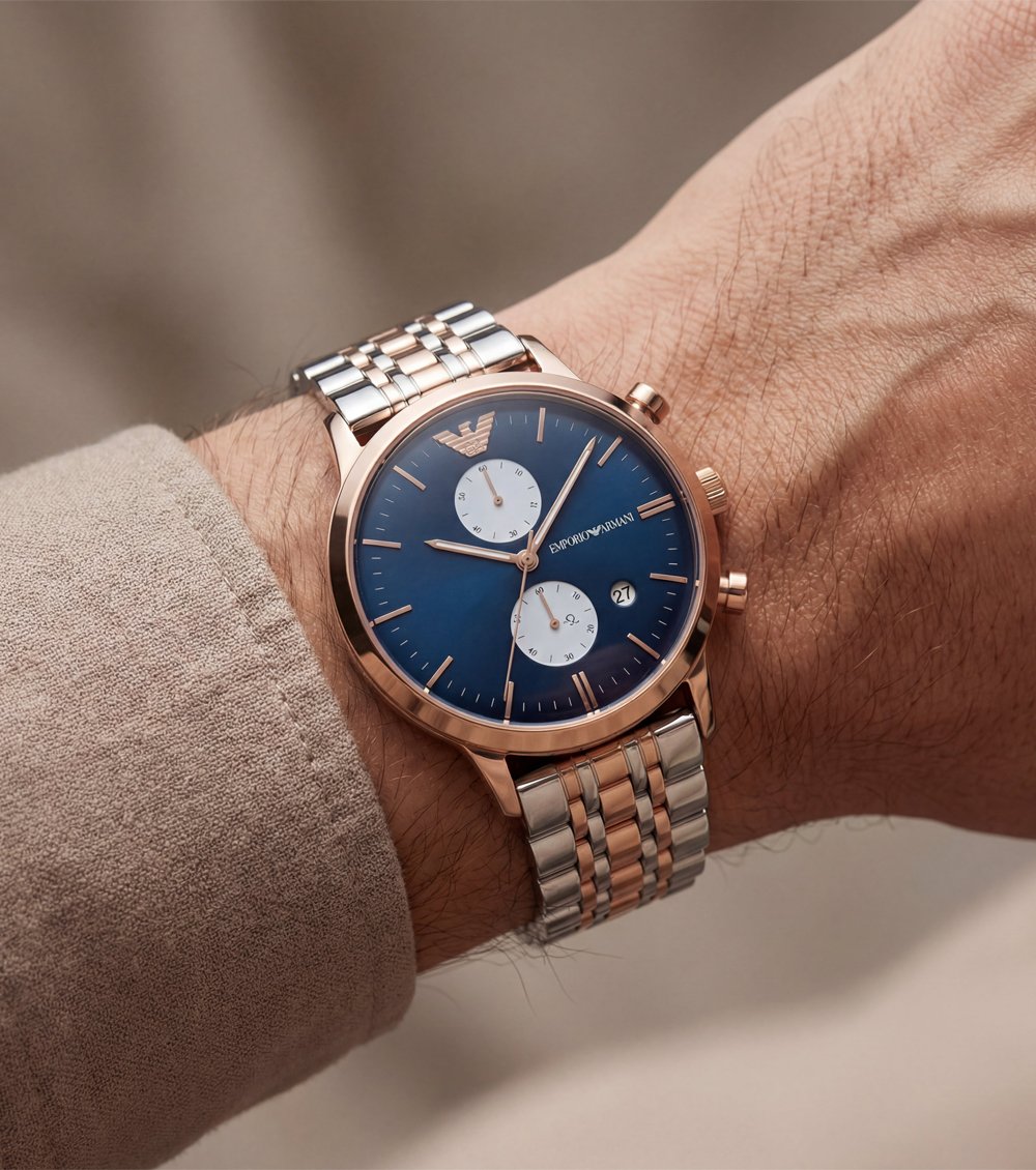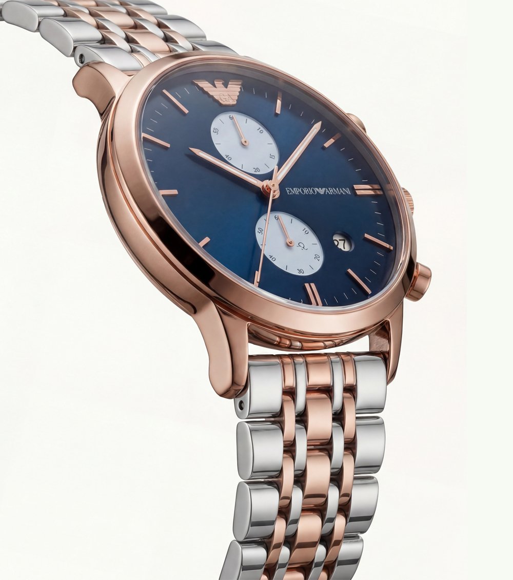 The deep navy blue sunburst dial delivers a bold yet classy presence, enhanced by rose gold hands and slim hour markers for crisp readability. Dual chronograph sub-dials add functional depth, while the discreet date window ensures everyday practicality without disturbing the clean, minimalist aesthetic.