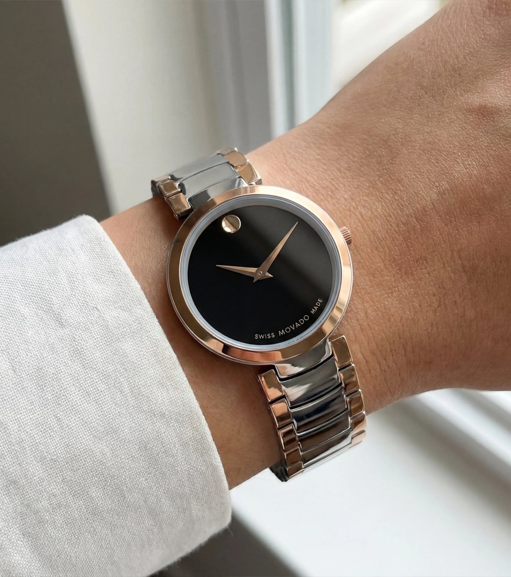 This sophisticated timepiece blends contemporary minimalism with refined two-tone styling. The polished rose-gold bezel pairs beautifully with the sleek stainless steel and rose-gold bracelet, creating a balanced and versatile luxury aesthetic.