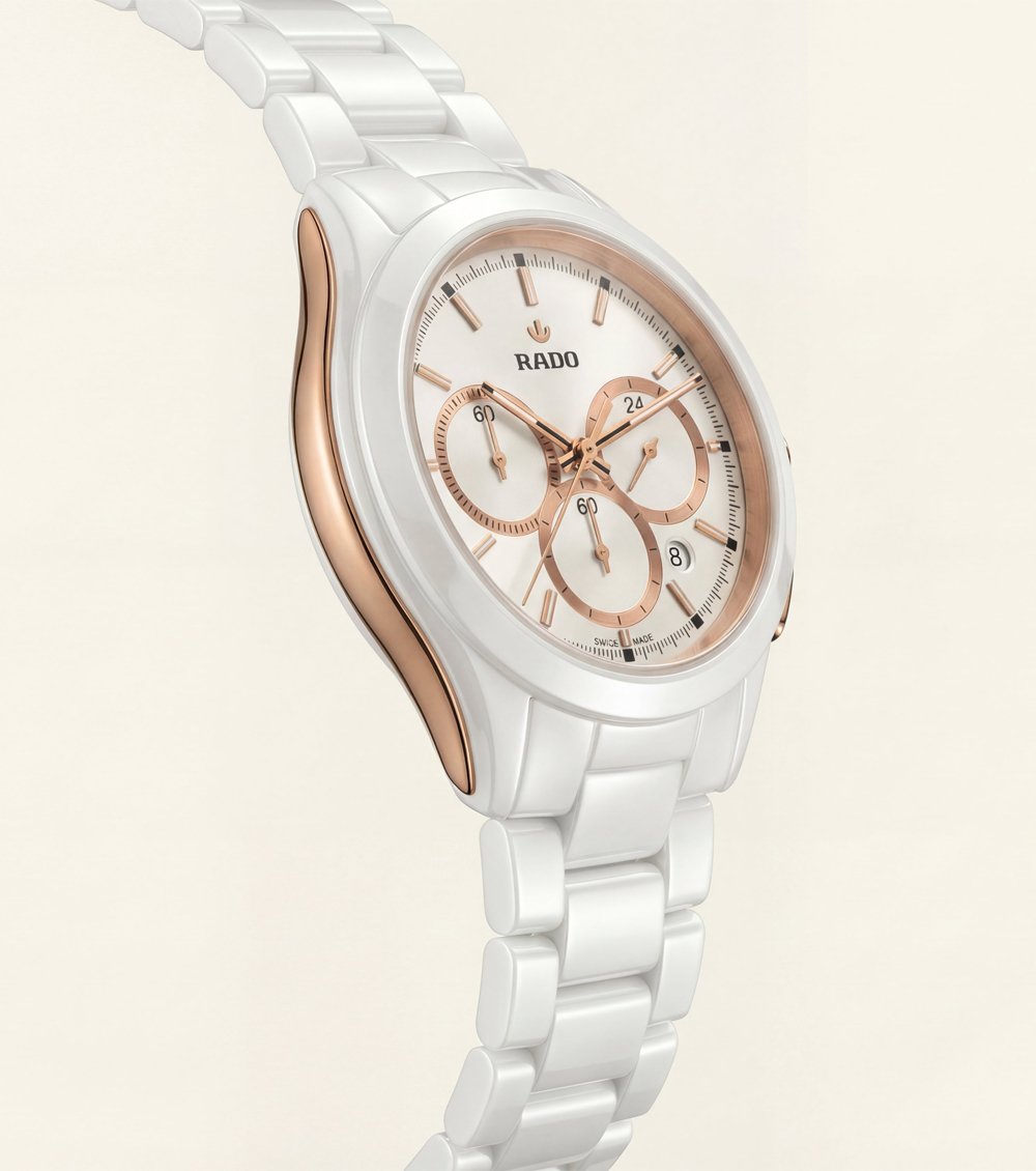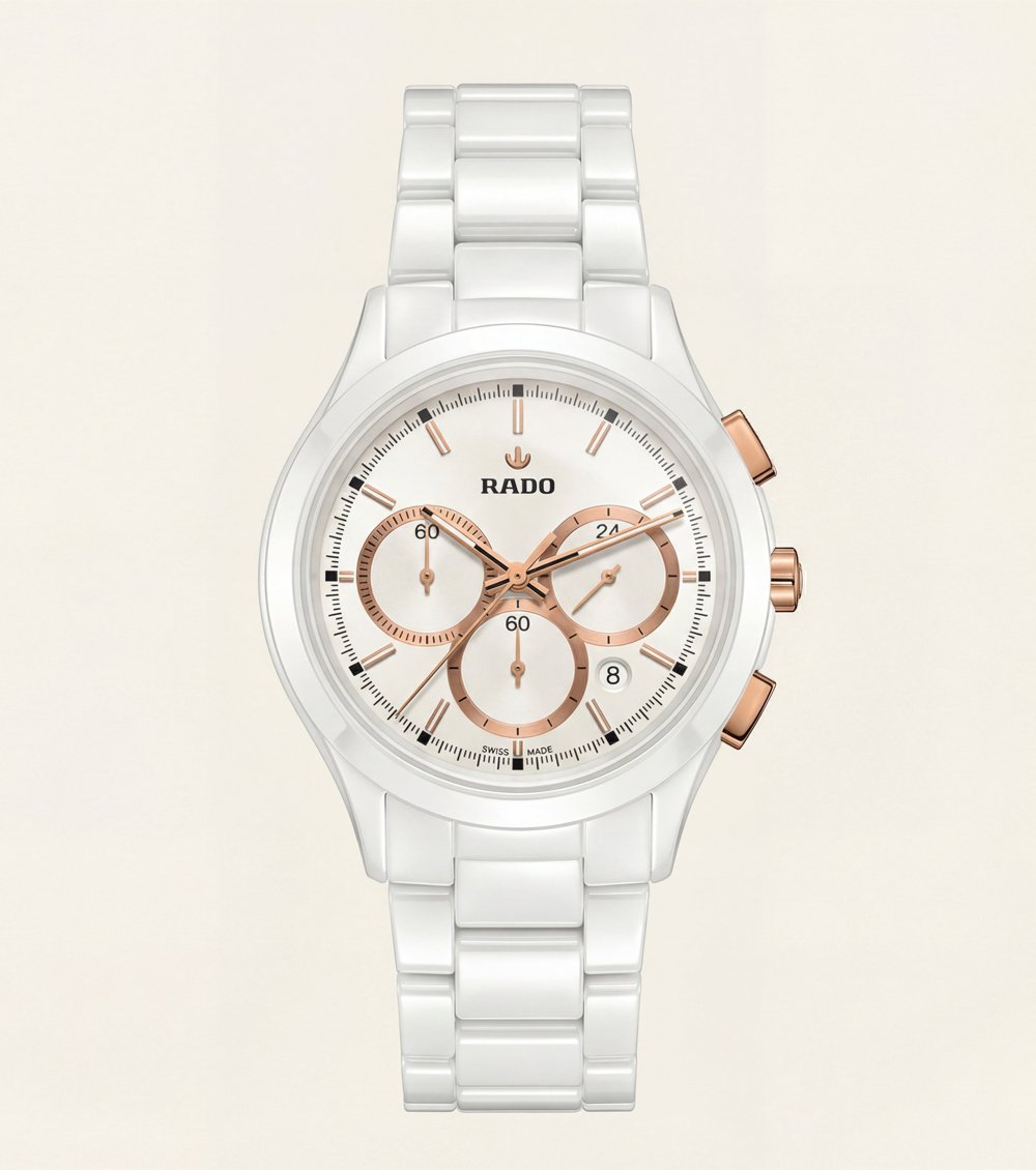 This elegant chronograph Men’s watch features a refined white ceramic body paired with warm rose-gold tone accents for a clean yet luxurious appearance. The crisp white dial is enhanced with three perfectly balanced chronograph sub-dials, slim applied hour markers, and matching rose-gold hands that add sophistication and clarity.